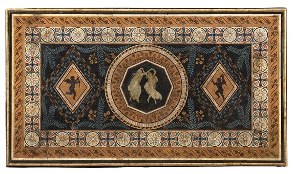 Piano in scagliola decorata in stile classico, centrato da ottagono con danzatrici, ai lati amorini entro rombi tra fiori e motivi vegetali. Cornice a doppio ordine con elementi stilizzati e foglie. Base in legno con fascia e gambe sagomate. Secolo XIX (cm 100x39x55) (difetti)