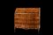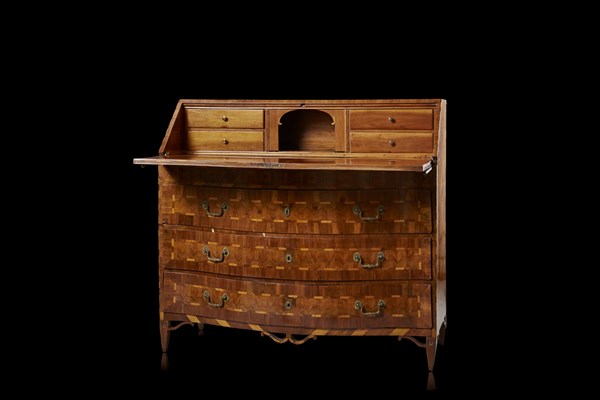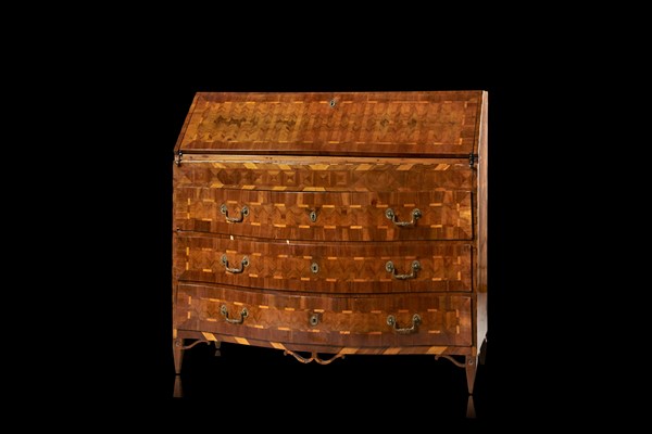 Ribalta lastronata con fronte bombato a tre cassetti interamente intarsiati in legni vari a motivi geometrici. Anta ribaltabile celante scarabattolo, cassettini, vano e tiretto con segreti. Piedi sagomati intagliati all'attacco a rosone. Piacenza, fine secolo XVIII (cm 122x115x59) (difetti)
