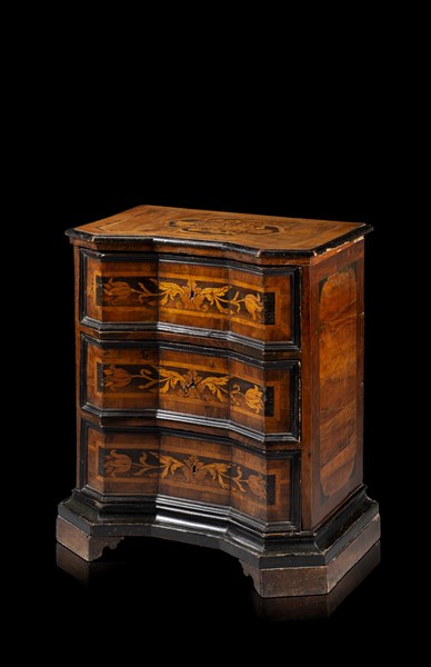 Comodino lastronato di forma scantonata a tre cassetti con fronte e coperchio intarsiati in legni vari a fiori e volute. Profili ebanizzati. Padova, secolo XVII (62x88x46) (difetti)