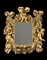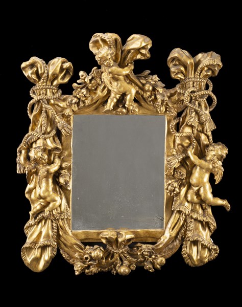 Specchiera in legno intagliato e dorato decorata nella cimasa e nei montanti da cherubini alati che sorreggono tendaggio con nastri, fiori e frutti. Fine secolo XVII (cm 80x85) (difetti, doratura d'epoca posteriore)