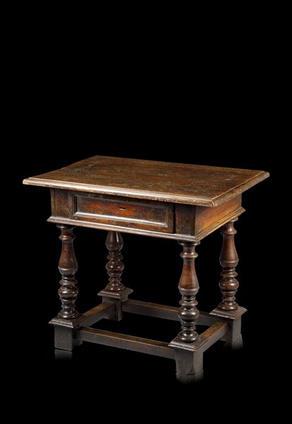 Tavolino in noce di forma rettangolare con un cassetto sottopiano, gambe tornite poggianti su piedi a plinto riunite da traverse squadrate. Bologna, secolo XVII (cm 88x76x63) (difetti)
