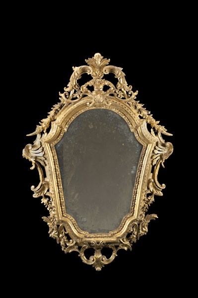 Specchiera in legno intagliato e dorato con cimasa sormontata da vaso fiorito e volute, fregi traforati con foglie e mascheroni. Centro Italia, secolo XVIII (cm 160x110)