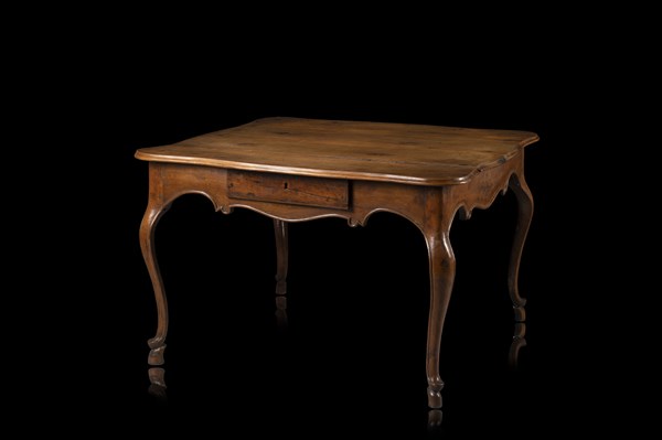 Tavolo in noce con piano sagomato, fascia mossa a due cassetti, gambe terminanti a zoccolo. Bologna, seconda metà secolo XVIII (cm 122x76x122) (difetti)