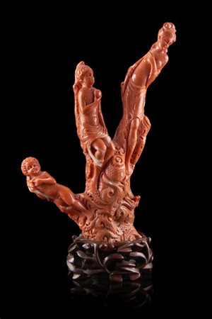 Sculptor of the early 20th century. Carved coral branch with female figures and putto (h. cm 18) On carved wooden base