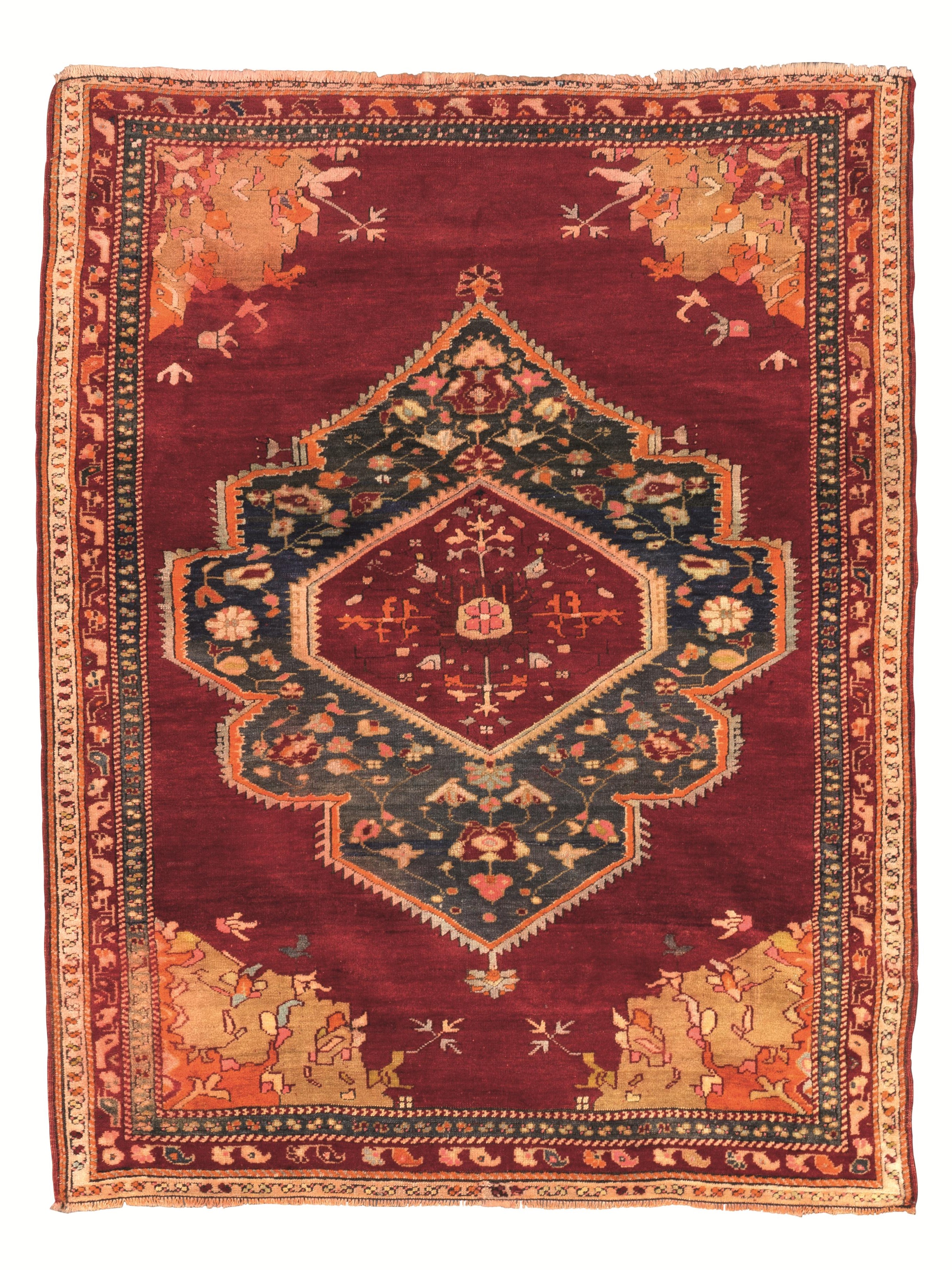 Tappeto caucasico Karabak, inizi sec. XX, fondo rosso con medaglione color petrolio con piccoli decori variopinti, riquadri giallo ocra con bordura avorio, cm 180x135
