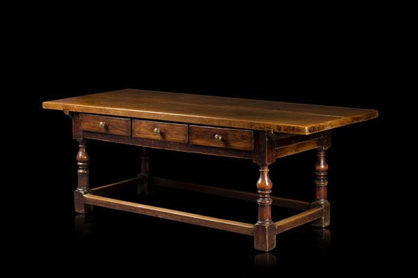 Tavolo in noce di forma rettangolare a tre cassetti sottopiano con sostegni torniti terminanti a plinto riuniti da traverse squadrate. Bologna, secolo XVII (cm 230x81x96) (difetti)