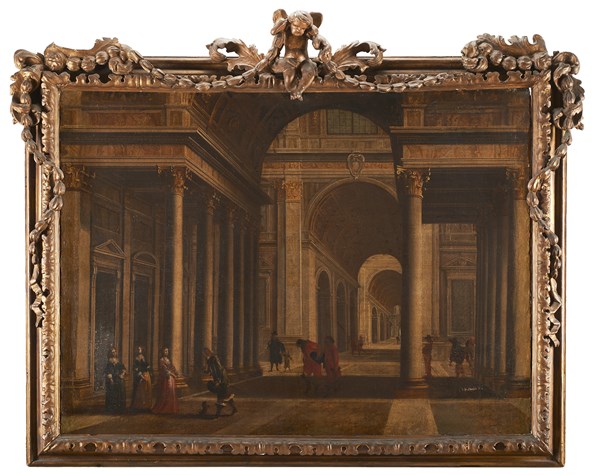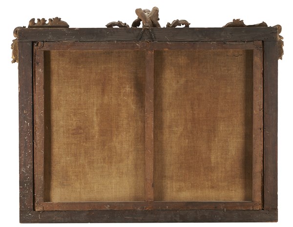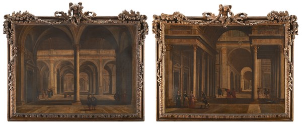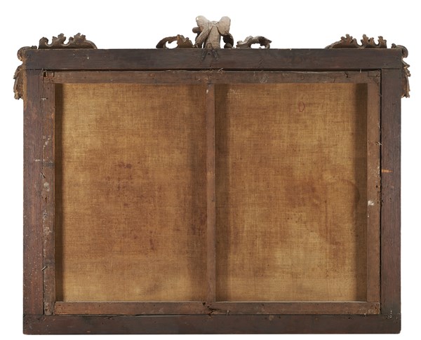 in coeval wooden carved and gilded frames, surmounted by winged cherubs holding bouquets of flowers (defects, restorations and losses)