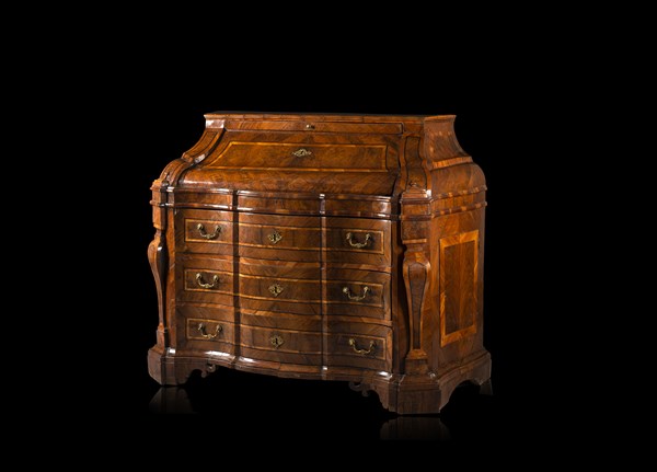 Ribalta con fronte e fianchi mossi lastronata e filettata in legni vari, parte superiore con un cassetto sottopiano ed anta ribaltabile con vani, cassettini e segreto. Parte inferiore con fronte a tre cassetti e due ante nei fianchi con montanti a lesene terminanti a pinnacoli intagliati, piedi a mensola. Modena, secolo XVIII (cm 160x120x63) (difetti e restauri)