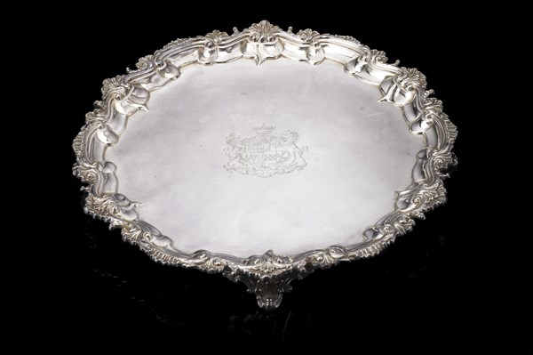 Salver in argento centrato da stemma nobiliare inciso e decorato nel bordo a valve di conchiglia tra volute fogliate. Piedini sagomati. Recante punzoni di Londra del 1831 (d. cm 35,5) (g 1360) (difetti)
