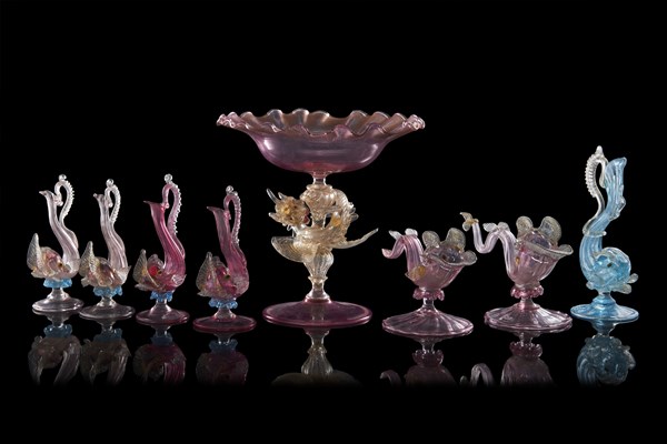 Manifattura di Murano, secolo XIX. Centrotavola in vetro e pasta vitrea policroma composto da un'alzata con fusto decorato a drago alato e sette vasetti porta fiore a foggia di delfino a tutto tondo (difetti)