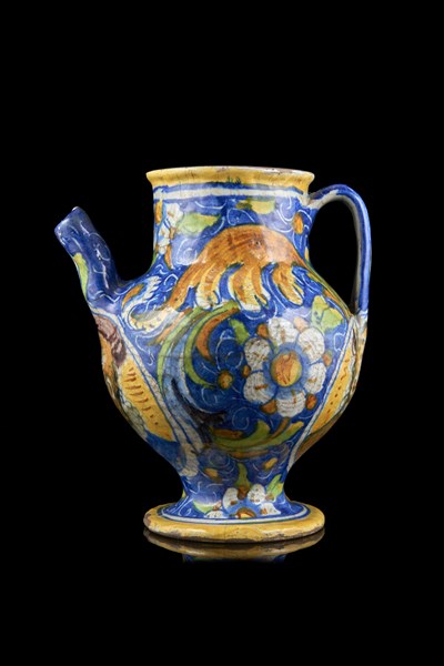 Venice manufacture, second half of the 16th century. Mastro Domenico workshop. Polychrome majolica jug (h. cm 20,5) (defects)