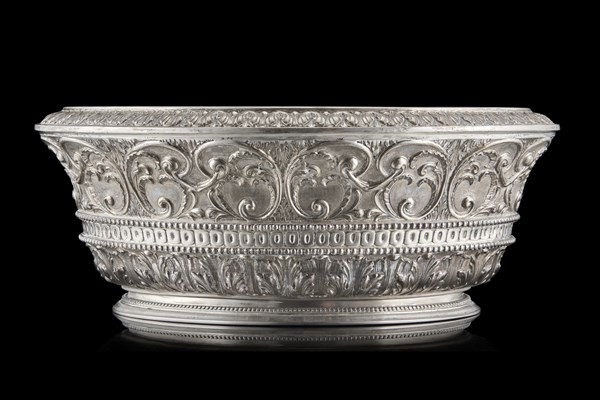 Rinfrescatoio in argento sbalzato decorato a volute fogliate e motivo cordonato