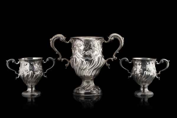 Gruppo di tre coppe biansate di simil decoro in argento con corpo sbalzato a frutti e fiori, anse sagomate decorate a volute, stemma nobiliare inciso. Punzoni differenti (h. max cm 23) (g 2300) (difetti)