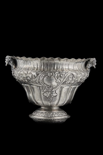 A double-handled Milanese silver cooler decorated with grape shoots and satyr-heads handels. Title 800. Silversmith Speronari? (g 1750) (minor defects)