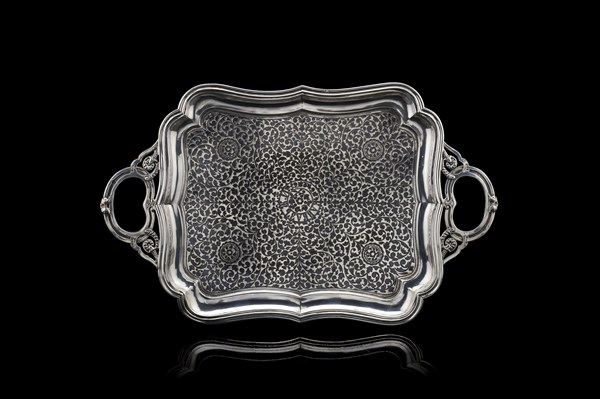 Vassoio biansato in argento a bordo mosso con cavetto traforato recante iscrizione. Punzoni di Mosca, 1871. Argentiere Aleksey Stefanov (L. cm 44) (g 700) (difetti)