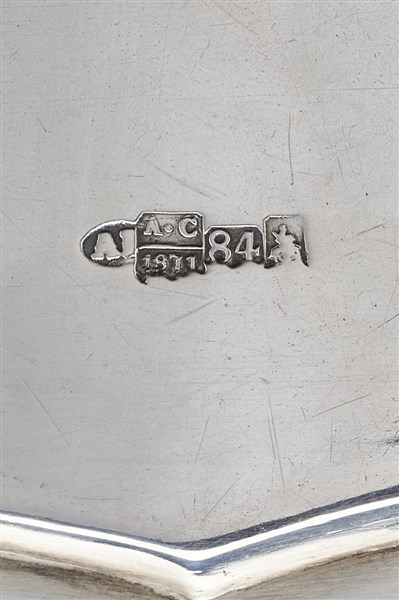 Vassoio biansato in argento a bordo mosso con cavetto traforato recante iscrizi