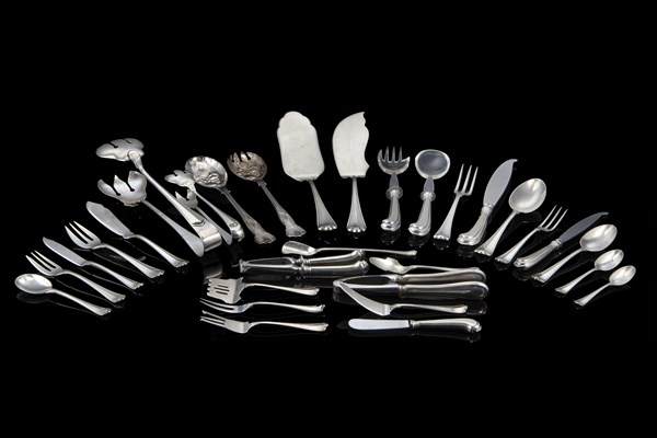 Servizio di posate in argento con prese sagomate, composto da: ventiquattro forchette grandi e dodici piccole, dodici forchette da insalata, dodici da formaggio e dodici da frutta, dodici cucchiai grandi e dodici piccoli, dodici coltelli grandi e dodici piccoli, dodici coltelli da pesce e dodici da dolce, dodici cucchiaini da gelato, undici da dolce, dodici da tè e dodici da caffè, dodici posate a servire in argento e altri materiali e due schiaccianoci. Titolo 800. Punzoni di San Marco (g netti 6700) Unito a uno schiaccianoci in argento titolo 800 e due posate a servire cesellate a frutta in metallo (difetti e rotture)