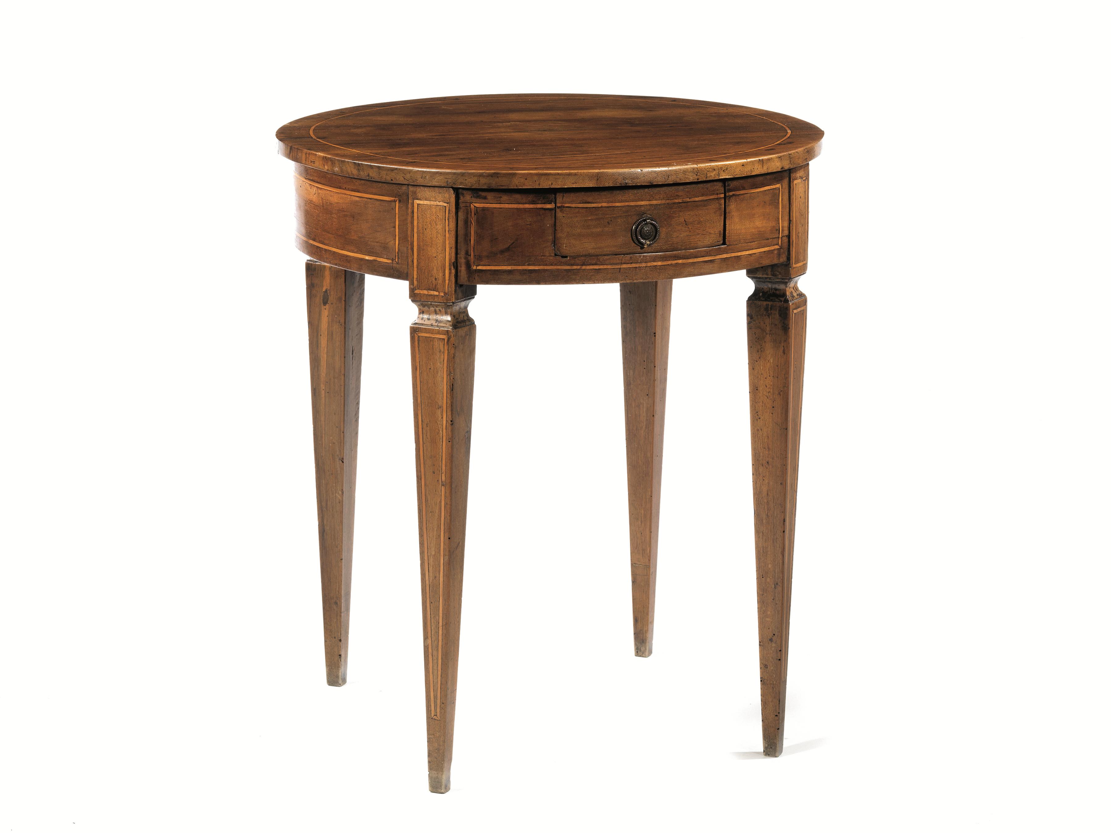 Tavolino da centro, Toscana, fine sec. XVIII, in noce filettato, piano circolare, un cassetto nella fascia, alte gambe troncopiramidali, diam. cm 65, alt. cm 71, piccoli danni