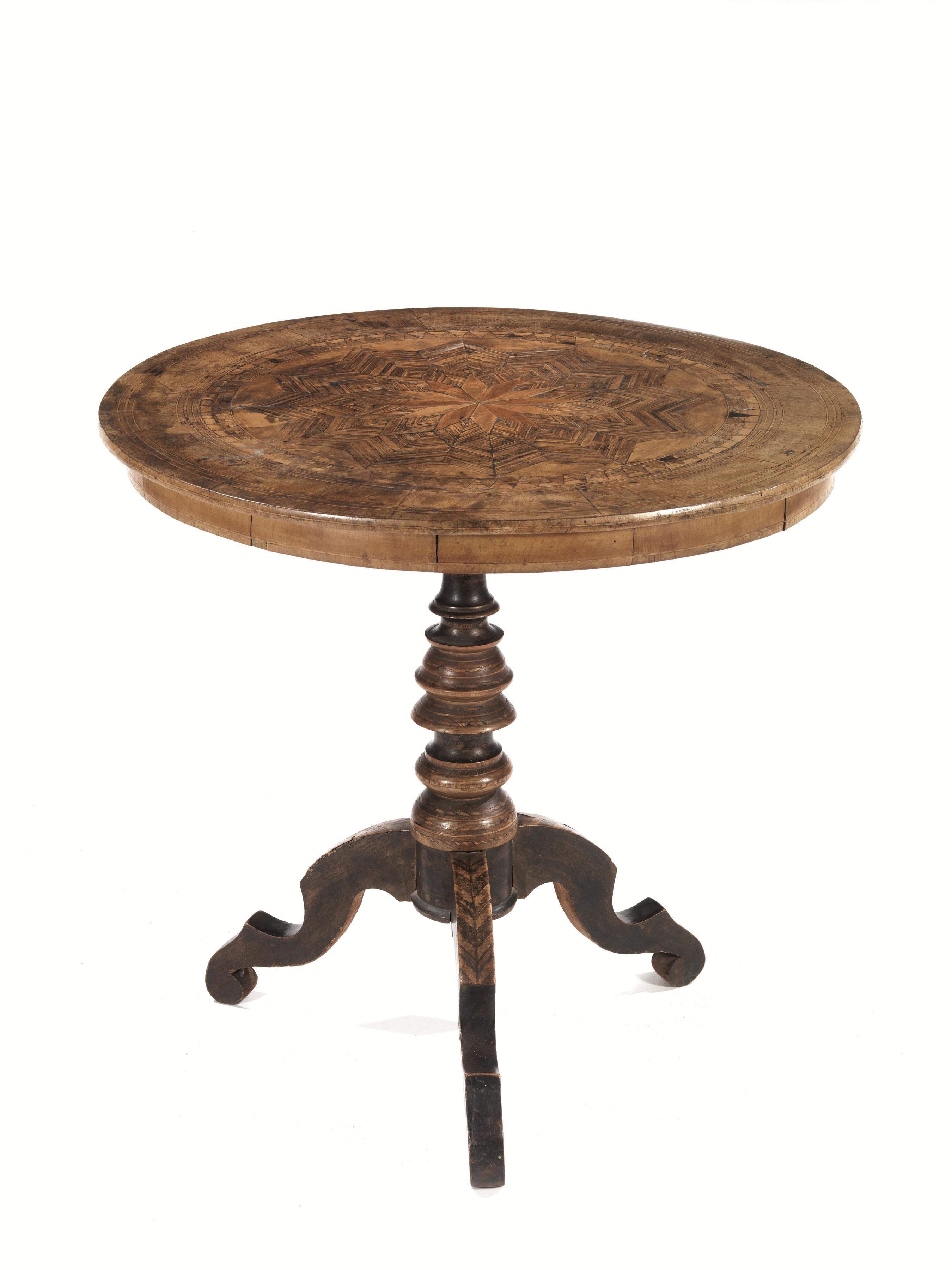 Tavolo da centro, Sorrento, fine sec. XIX, in noce intarsiato, piano circolare decorato da grande rosa dei venti entro cornici concentriche, fusto a balaustro su tre gambe mosse, diam. cm 74, alt. cm 76, alcune mancanze
