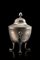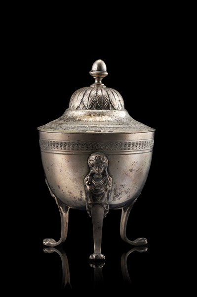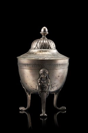 Zuccheriera con coperchio in argento con presa a trottola e fascia decorata a foglie d'acanto. Piedi ferini decorati da erme all'attacco. Stato Pontificio, secolo XIX (h. cm 16; d. cm 10) (g 400) (difetti)