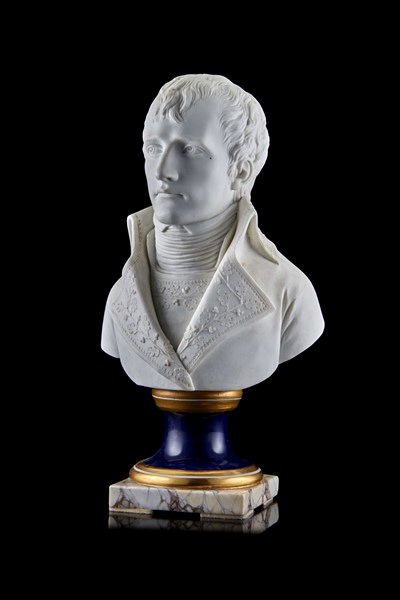 Scultore del secolo XIX ''Napoleone come primo console'' da Louis Simon Boizot. Busto in biscuit poggiante su sostegno a plinto in porcellana blu con bordo dorato e base quadrata dipinta a finto marmo (h. cm 27) (lievi difetti e restauri)