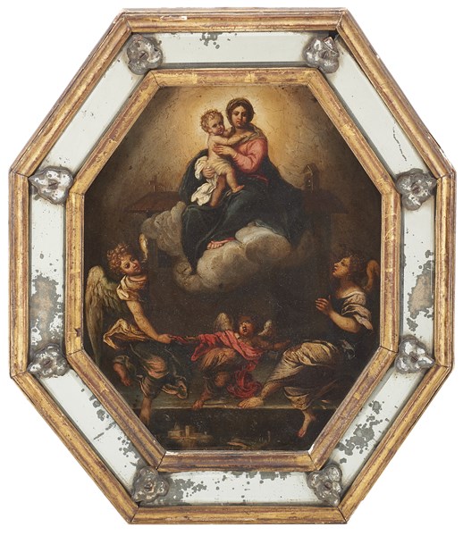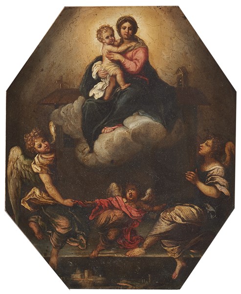 Scuola del secolo XVII La traslazione della Santa Casa di Loreto Olio su tela