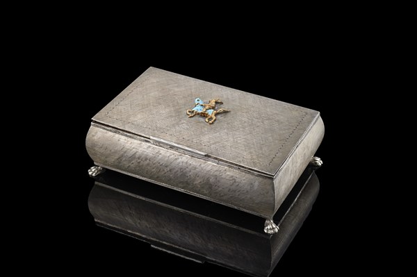 Scatola portagioielli in argento zigrinato, coperchio decorato da figure a cava
