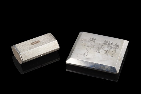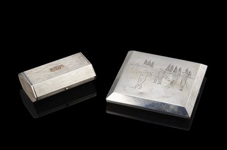 Due scatole portasigarette in argento, una con coperchio inciso a partita di go