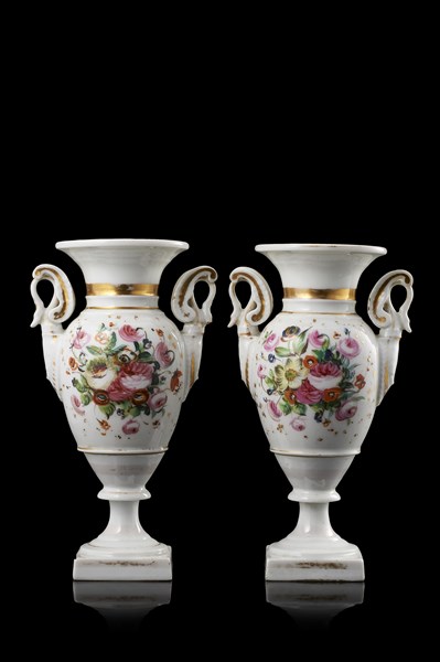 Manifattura francese, secolo XIX. Coppia di vasi biansati in porcellana dipinta in policromia con mazzi di fiori e dorature, anse a cigno (h. cm 22) (difetti e restauri)