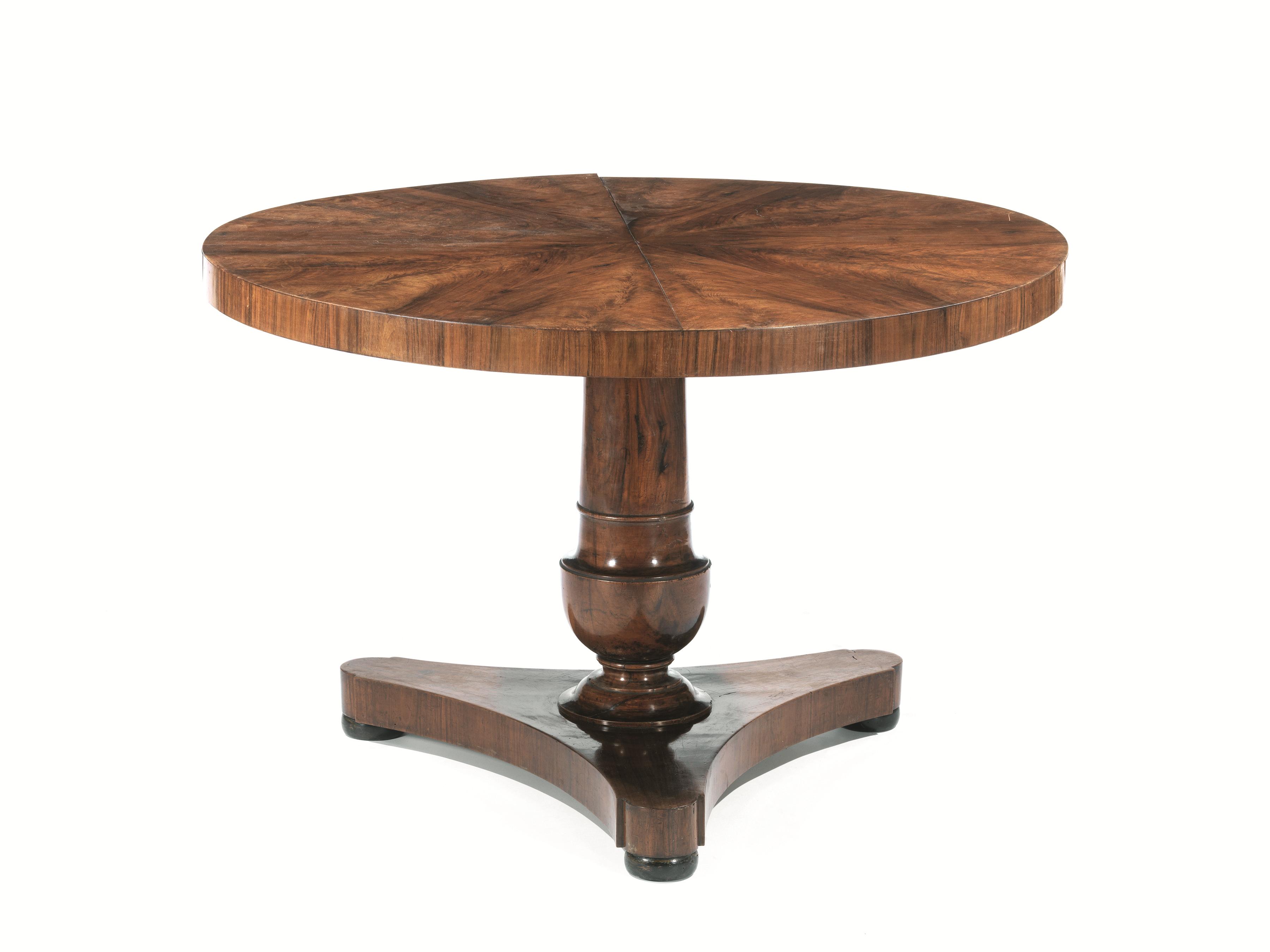Tavolo da centro, Toscana, prima metà sec. XIX, in radica di noce, piano circolare listrato a spicchi, fusto a balaustro, base triangolare, piedi a palla schiacciati, diam. cm 121, alt. cm 77, danni al piano