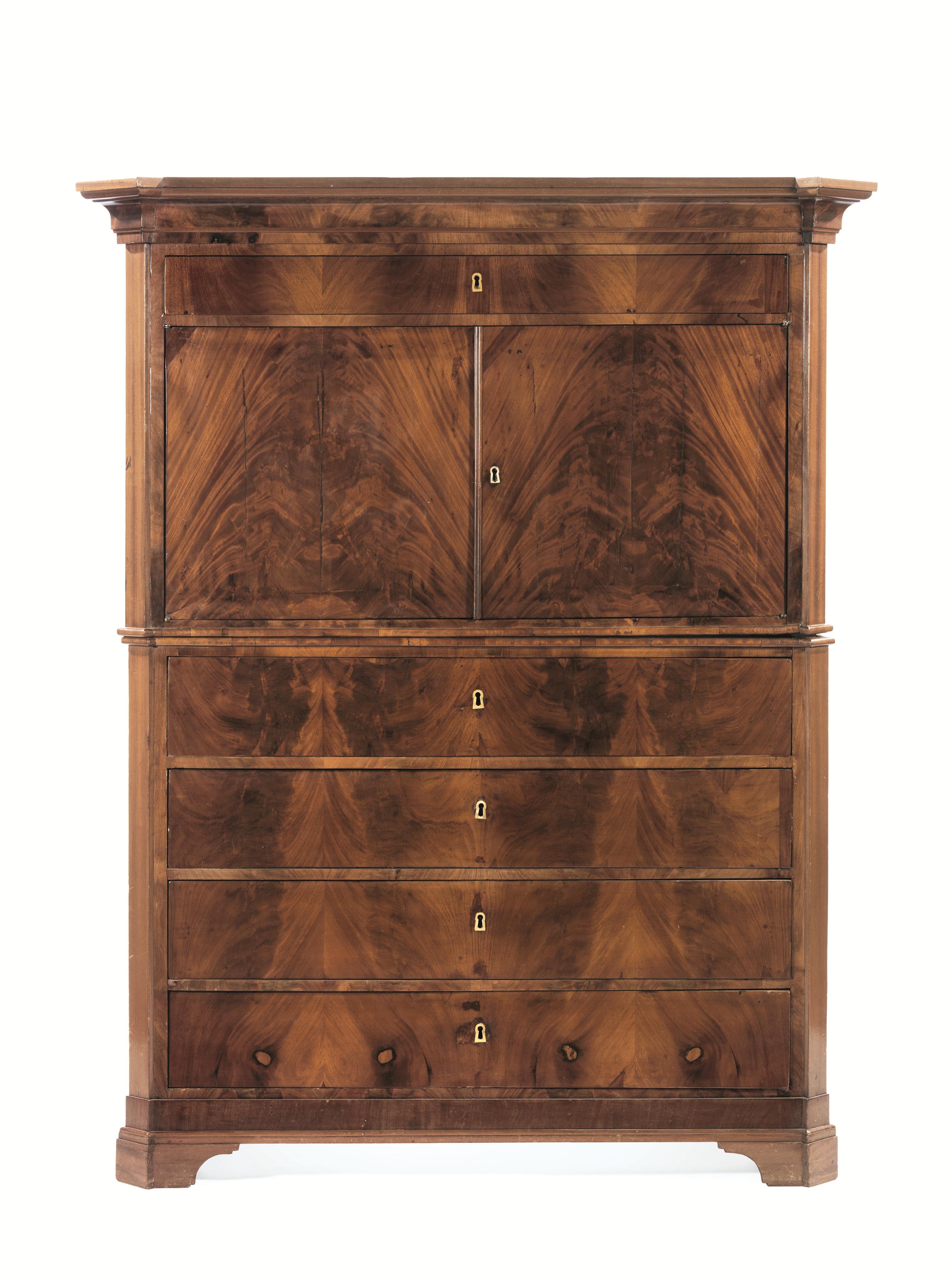 Chiffoniere, Sicilia, inizi sec. XIX, in piuma di mogano, parte superiore a due sportelli ed interno con cassetti, segreti e vano a giorno, parte inferiore a quattro cassetti, base modanata, piedi a mensola, cm 144x52x181, alcuni danni