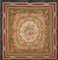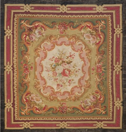 Tappeto Aubusson, Francia, metà secolo XIX. Decoro con grande medaglione a fondo bianco centrato da un bouquet di fiori con cornice a volute nei toni del rosa, lilla, albicocca e nocciola. Fondo color verde oliva, cornice principale a mazzi di fiori e volute su un ulteriore fondo verde reseda. Bordura geometrica stilizzata nei toni del bordeaux e rosso amaranto con cornici beige in tonalità. Bordura esterna tinta unita color nero base rossa (cm 305x282) (difetti, rapature e piccole scuciture)