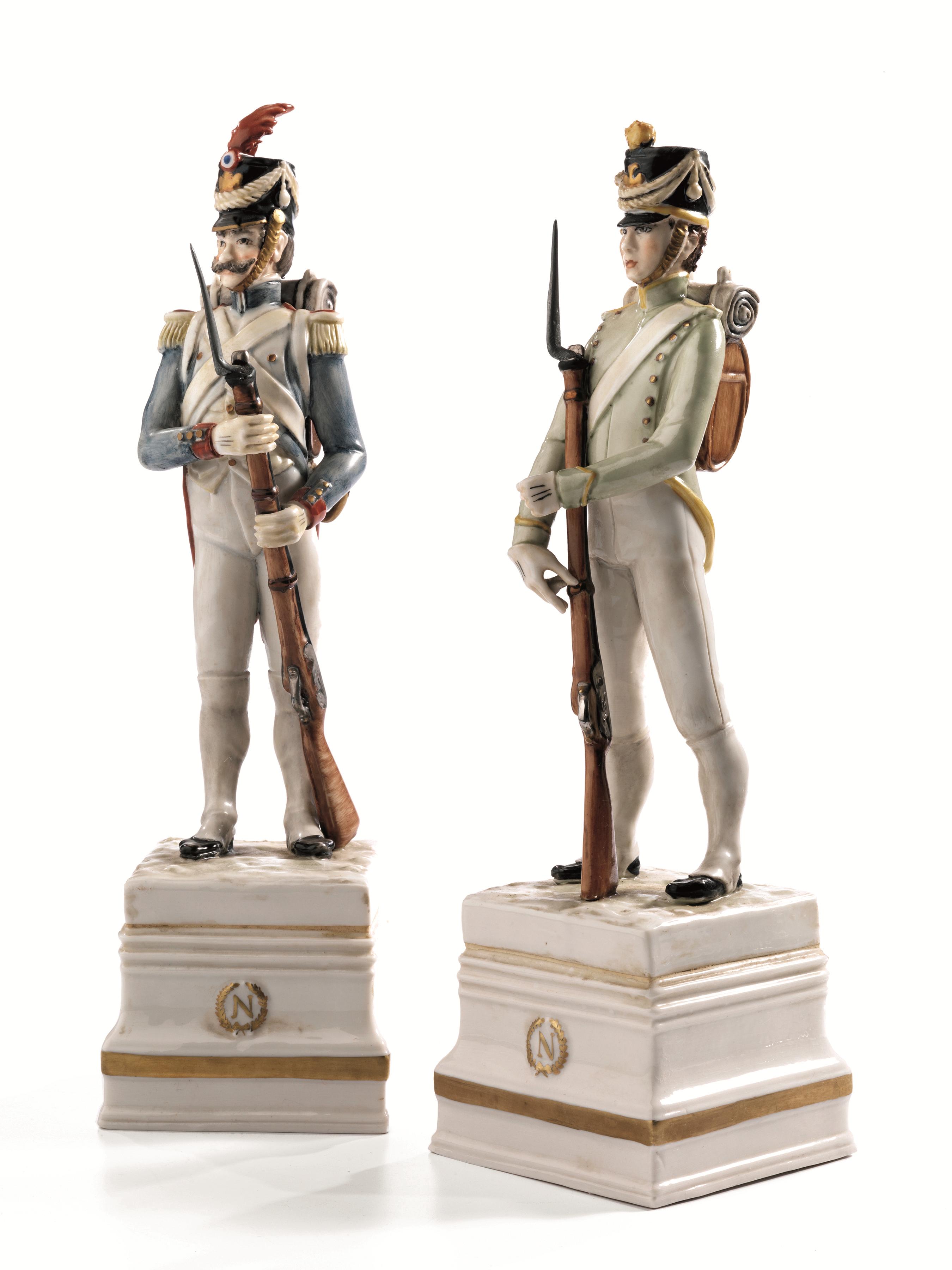 Due statuine, sec. XIX, Manifattura Cacciapuoti, in porcellana, raffiguranti granatieri napoleonici, ognuno su base a plinto che reca lo stemma di Napoleone, sul retro presentano le iscrizioni "Pupilee" e "Fusillier Granatier", alt. cm 28,5 e cm 30 (2)