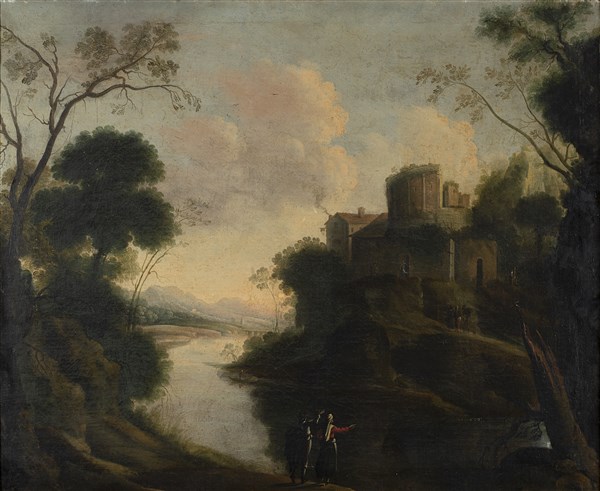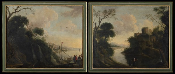 Paesaggio con mercanti e veliero; Paesaggio con figure presso un fiume e rovine sullo sfondo
