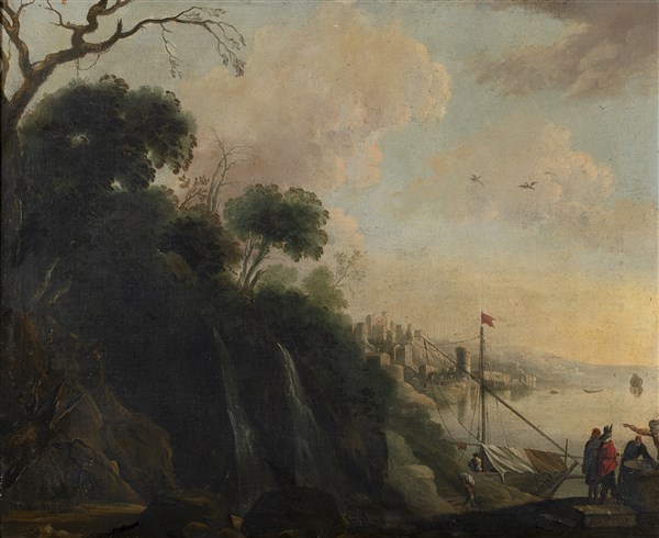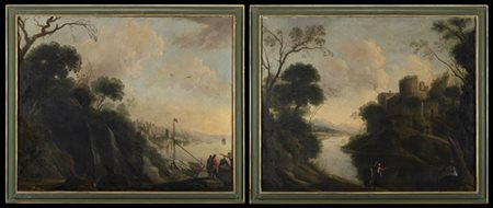 Scuola romana del secolo XVIII Paesaggio con mercanti e veliero; Paesaggio con