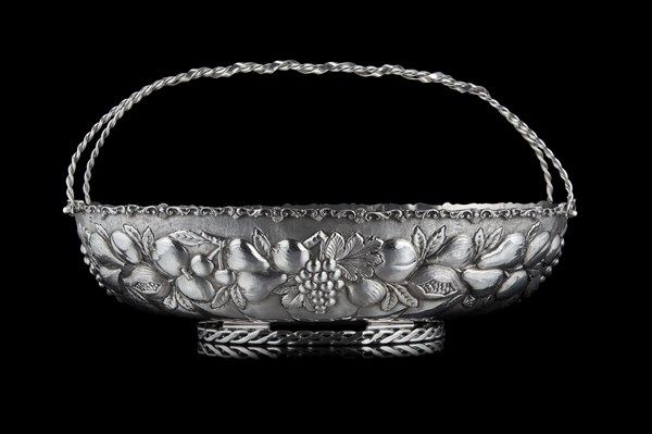 A silver fruit basket-shaped centerpiece. Faux wicker handles. Title 800 (cm 44,5x24) (g 1940)