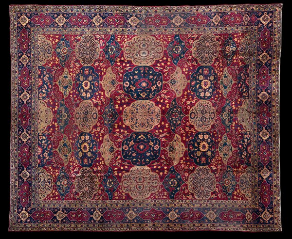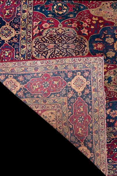 Tappeto Kirman, Persia, prima metà del secolo XX. Decoro a giardino con riserve alternativamente a fondo blu e beige su campo color ciclamino decorato da rami fioriti. Alternate alle file di riserve ci sono altre riserve a forma del piumaggio che decorava il copricapo dello Scià con arabe Fenici e fiori stilizzati. Bordura a cartigli color ciclamino e beige su fondo blu (cm 456x390) (difetti e rapature)
