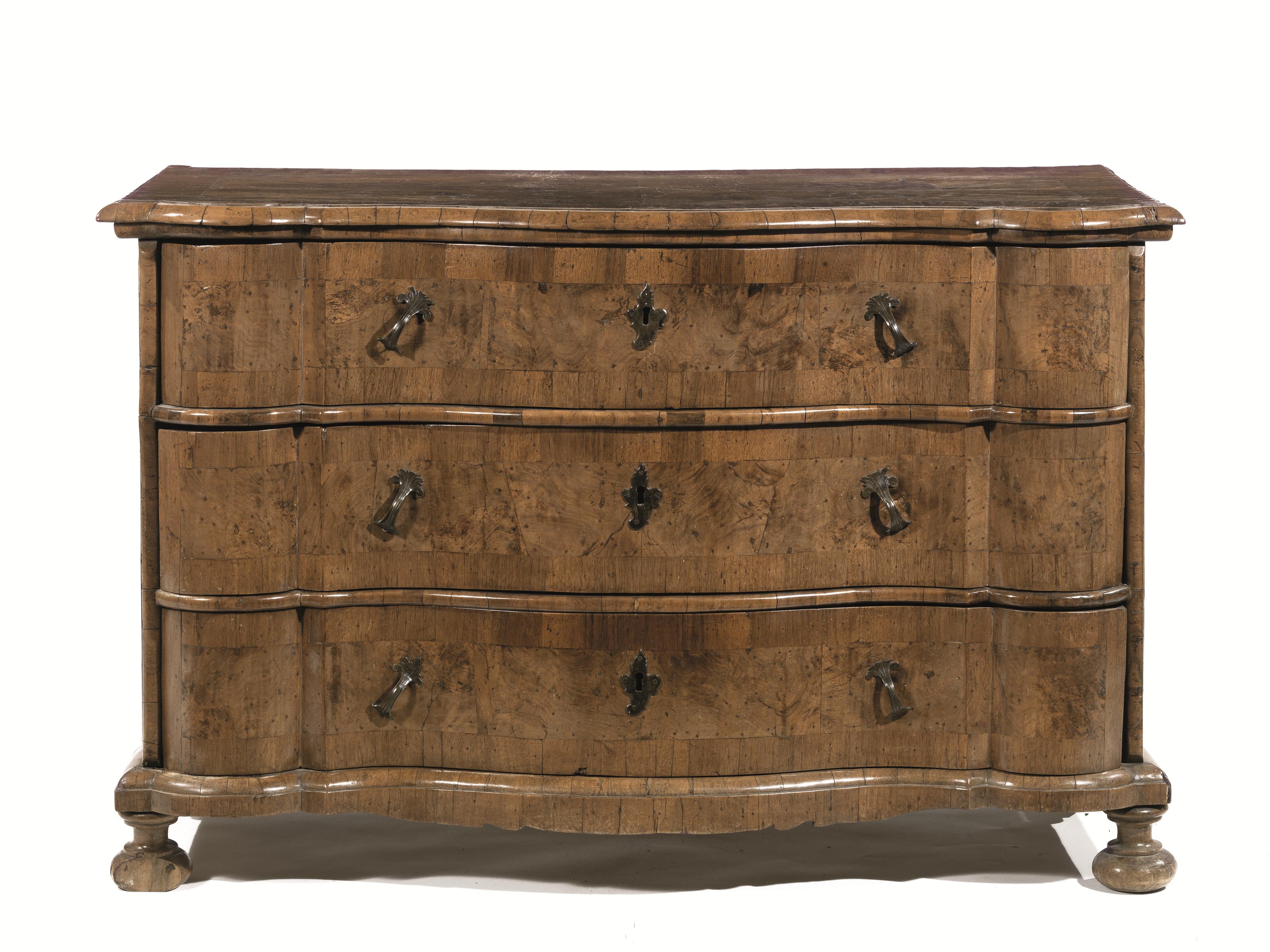 Cassettone, Ferrara, metà sec. XVIII, in noce e radica di olivo, piano sagomato con becco di civetta, fronte a doppia mossa, base modanata, piedi a cipolla schiacciata, cm 131x61x84, piccoli danni e zampe anteriori di restauro