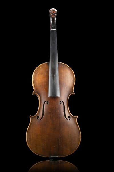 Fondo in due pezzi di acero a taglio tangenziale senza marezzatura, testa scolpita di leone a copia di Jacob Stainer databile alla fine del XIX secolo proveniente da un altro strumento, vernice non originale di colore marrone dorato, in discrete condizioni, etichetta «Alexander Gaglianus / me fecit Neapoli 1728» (lunghezza del fondo mm 362)