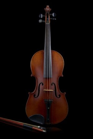 Two-piece back with narrow and light curl, varnish of a gilt-orange colour, without label, in decent condition (lenght of the back mm 361). With a shaped case and a bow marked «TZECHOLOSVAKIA»
