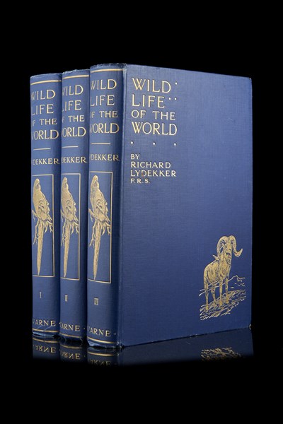 LYDEKKER, Richard. Wild life of the world. London: Warne [1916]. 3 vols, 4to, numerous color plates outside text and illustrations in text. Percalline publisher's binding with title and gilt decoration to plates and spine. Uncollected and defects to be examined
