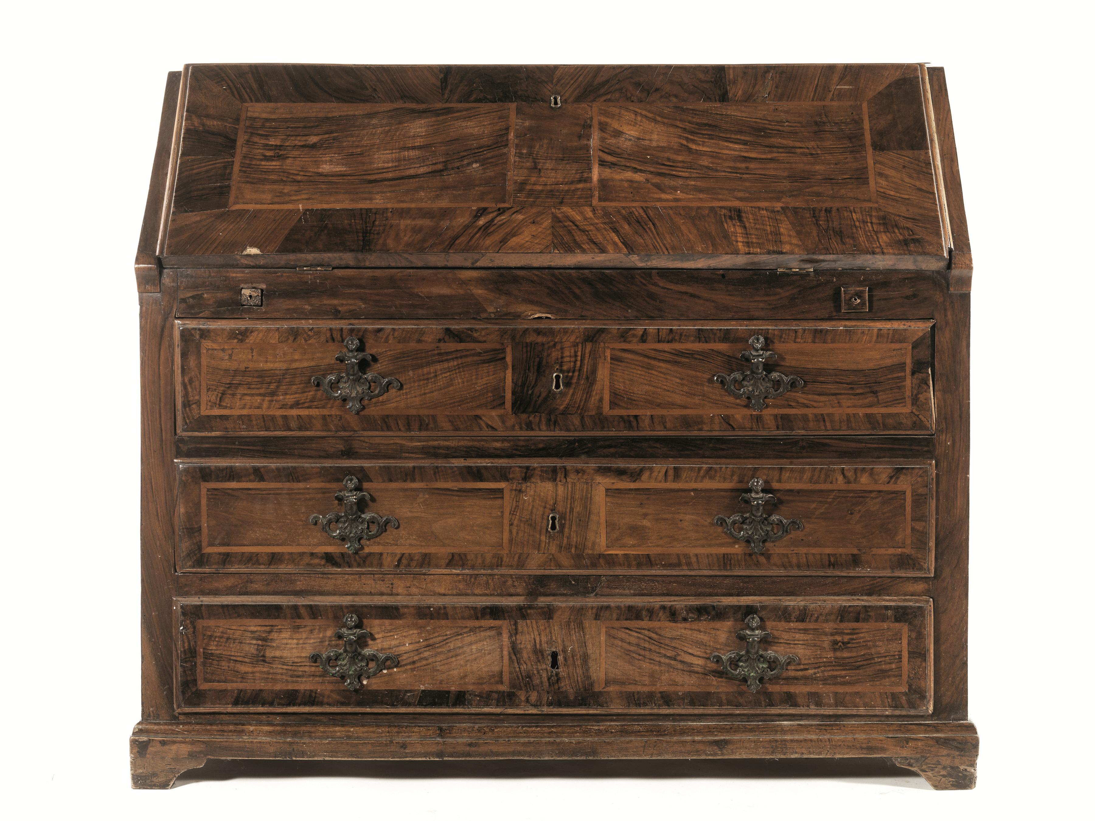 Cassettone scrivania, Toscana, fine sec. XVIII, in noce e radica di noce, sportello a ribalta, scarabattolo interno con cassetti e vani a giorno, tre cassetti sul fronte, base modanata, piedi a mensola, cm 115x50x98, piccoli danni e mancanze