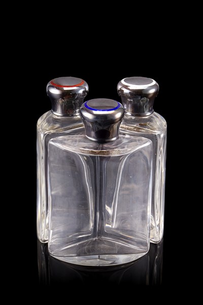Tre fiasche in vetro con tappi in argento e smalti. Londra, 1901. Argentiere GA