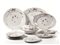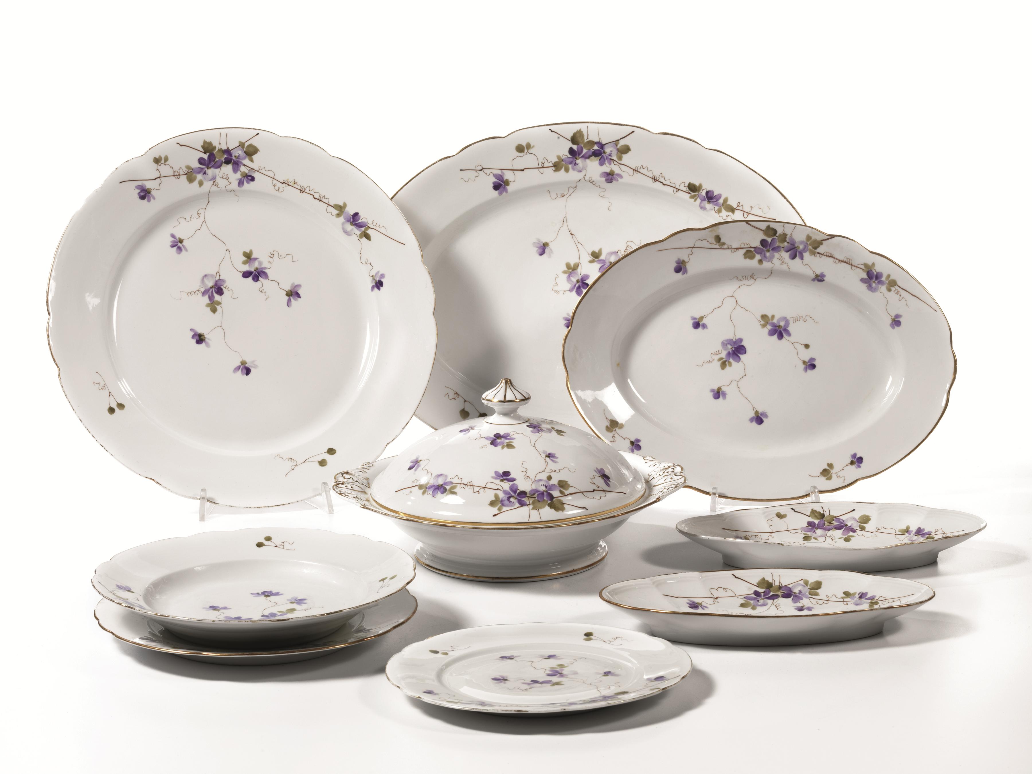 12 scodelle, 36 piatti piani, 12 piatti da frutta, 4 vassoi ovali di diverse misure, 1 vassoio tondo, 1 zuppiera e 2 raviere