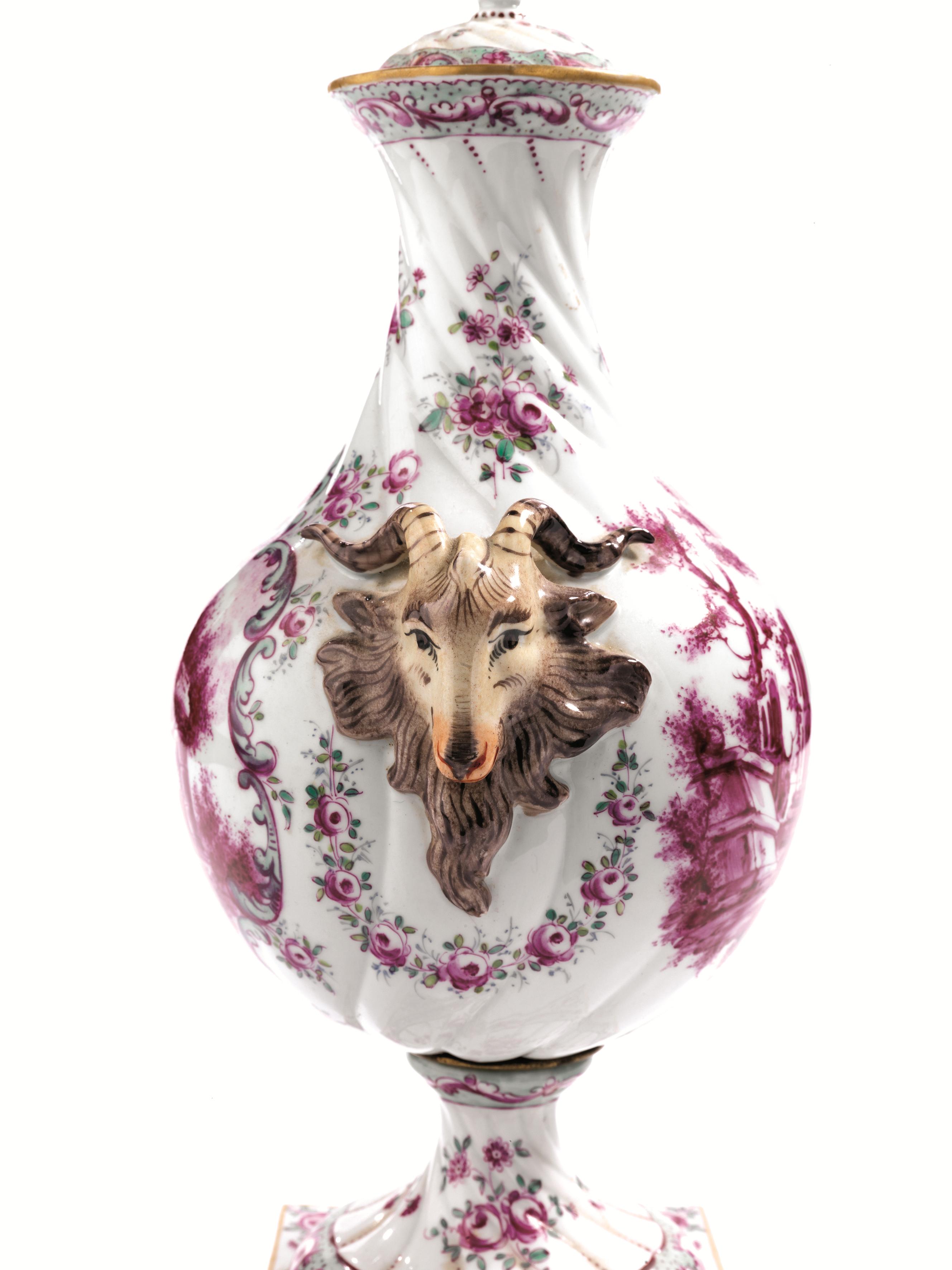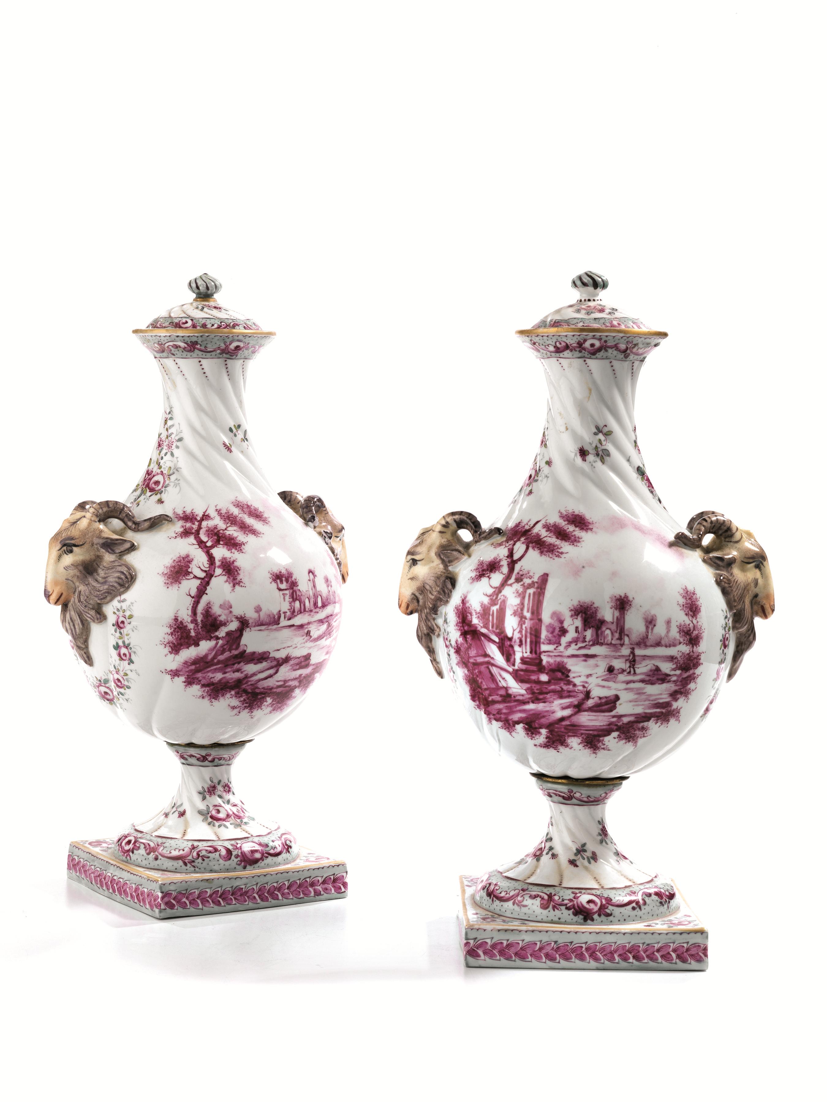 Coppia di vasi, Francia, sec. XIX, in porcellana dipinta in policromia, corpo tortile decorato a paesaggi con rovine, anse configurate a caproni, poggiante su base quadrata, alt. cm 34, un coperchio restaurato (2)