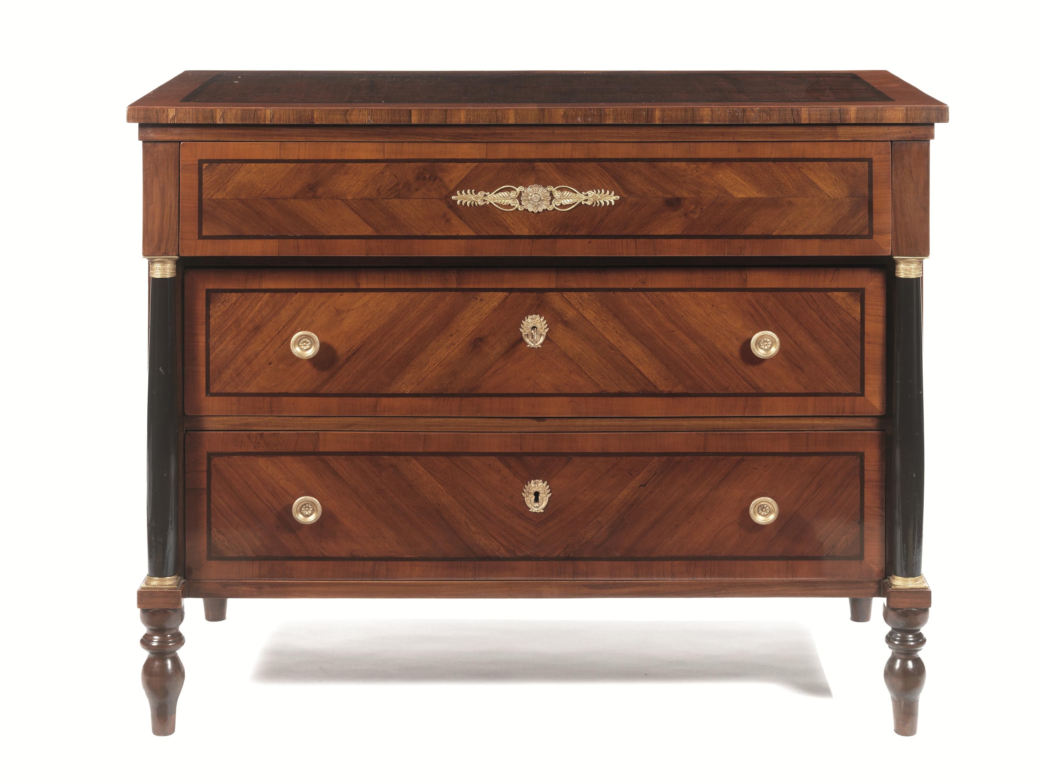 Cassettone impero, Toscana, inizi sec. XIX, in noce e ciliegio, un cassetto...