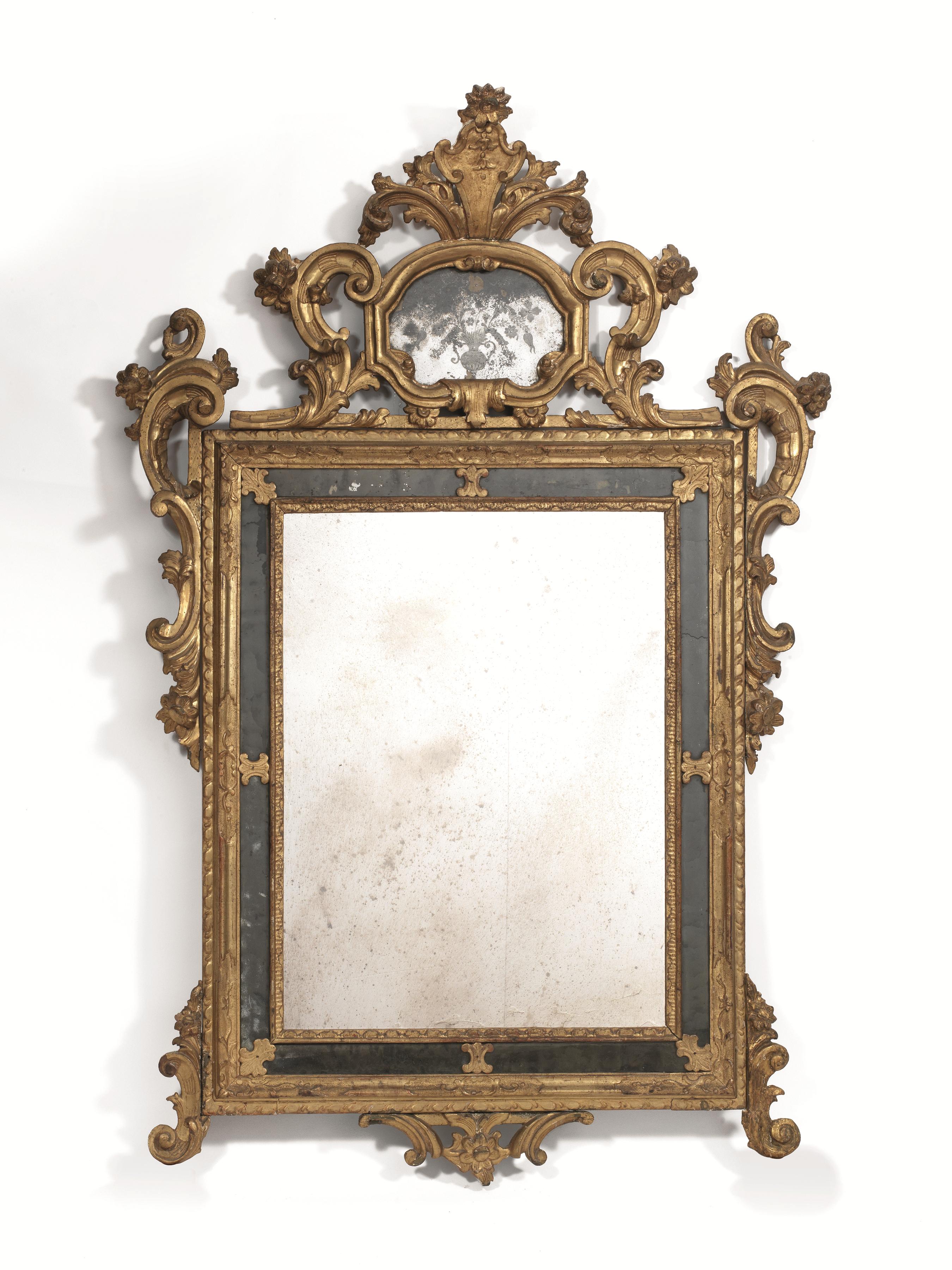 Specchiera, Venezia, metà sec. XVIII, in legno intagliato e dorato, alta cimasa a volute traforate centrata da specchio molato con vaso e composizione floreale, cornice rettangolare intagliata a motivi rocaille, tralci ricadenti lungo i lati, piedi a ricciolo, cm 157x106, restauri, specchio principale di epoca posteriore