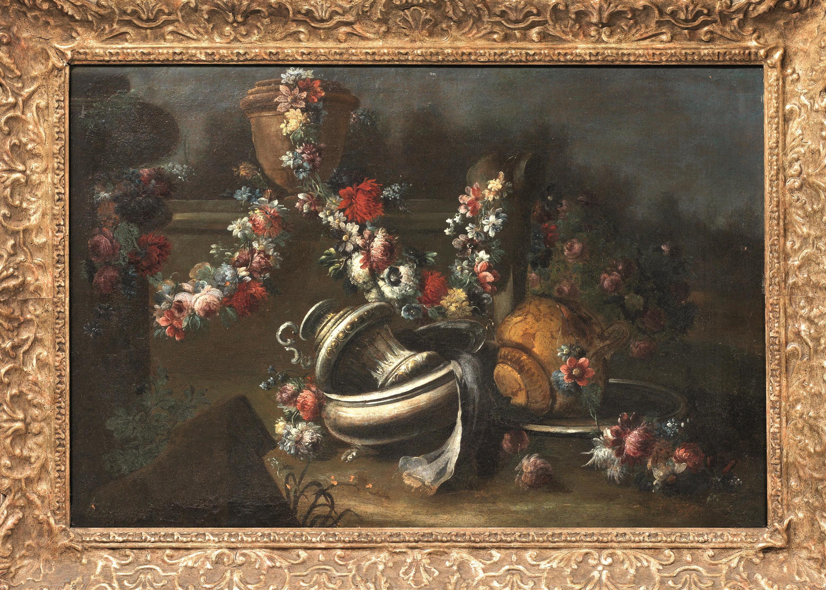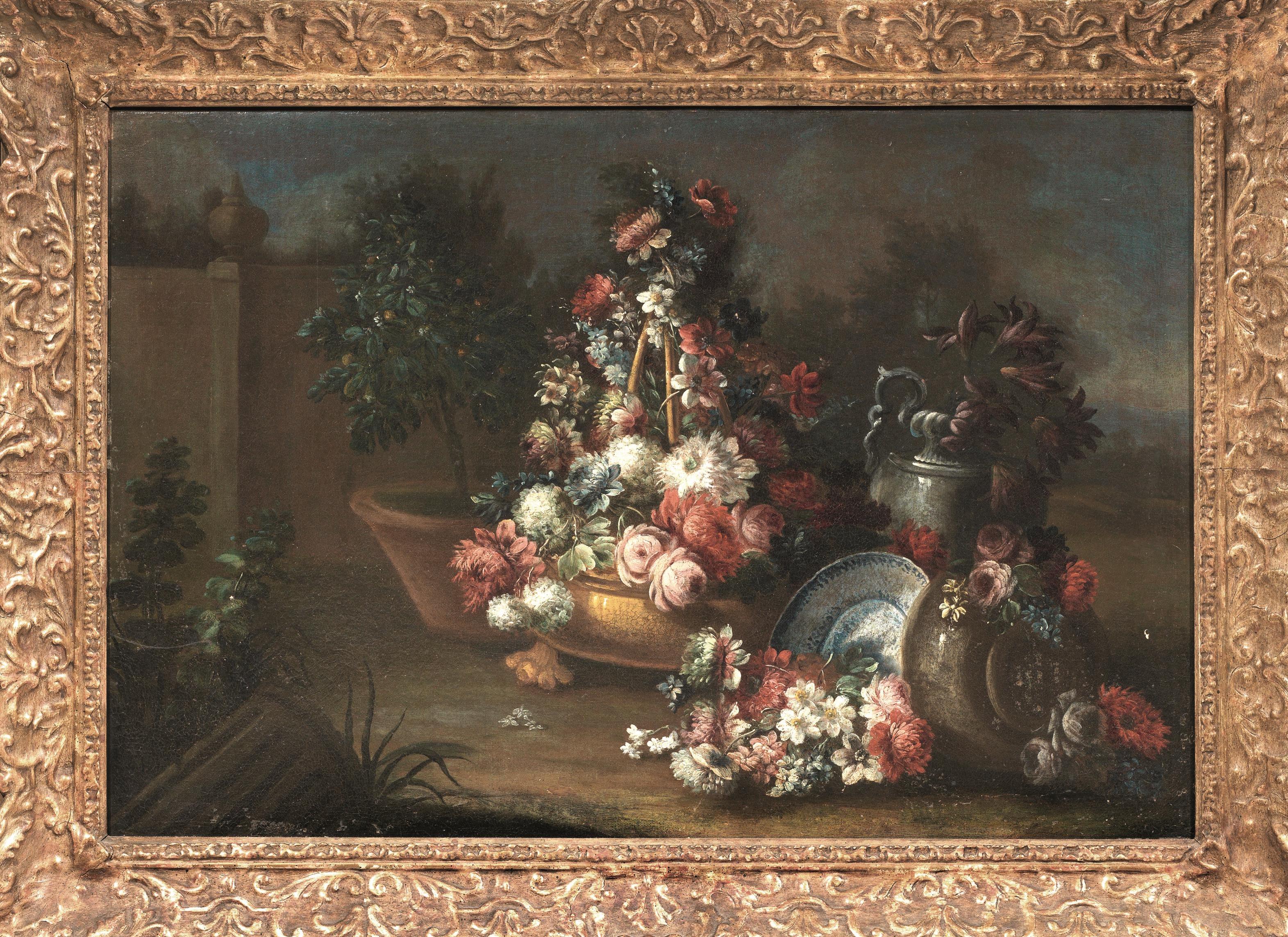 Scuola napoletana, sec. XVIIICOMPOSIZIONI FLOREALI E VASI METALLICI IN UN...