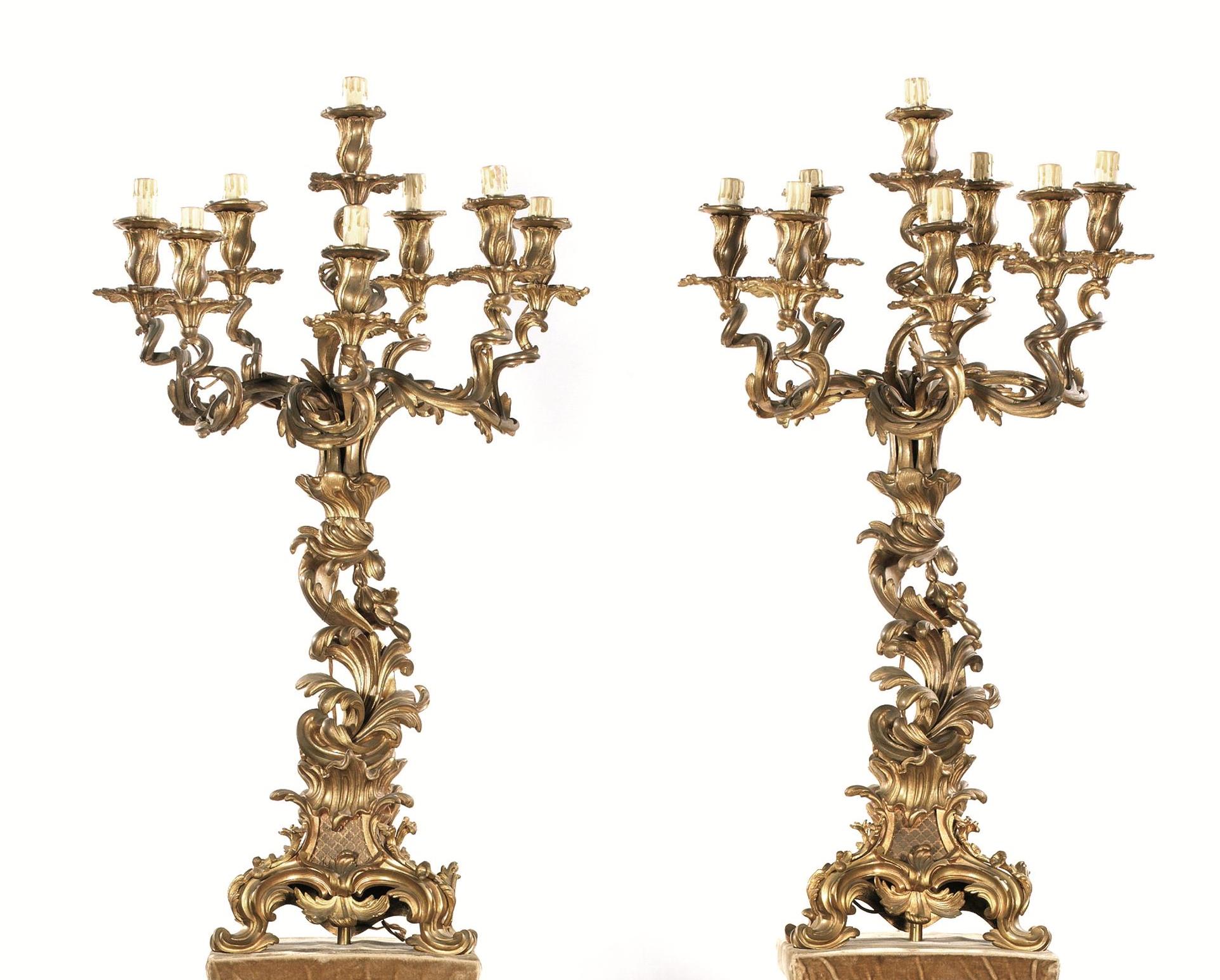Coppia di flambeaux, fine sec. XIX, in bronzo dorato, a nove luci, su basi di gusto rocaille, alt. cm 90 (2)