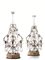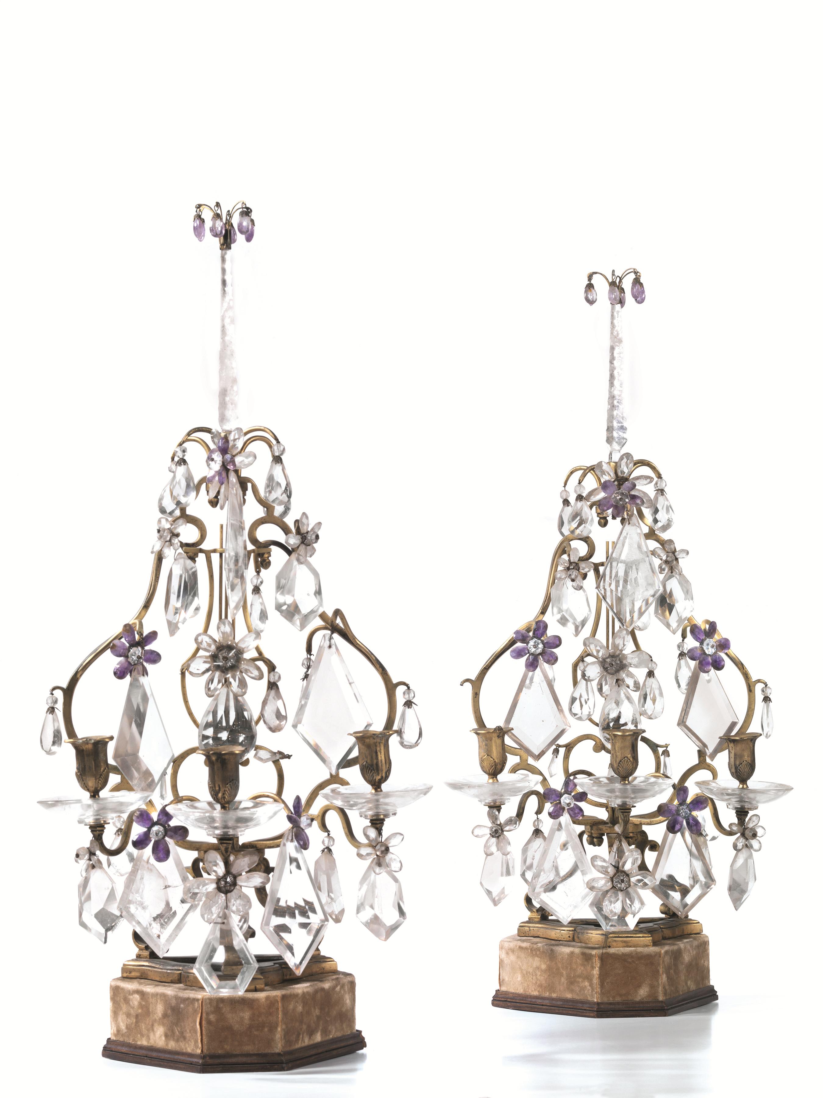 Coppia di girandoles, sec. XVIII, in bronzo dorato con pendenti in cristallo di rocca e ametista intagliati a fiori, ciascuna con tre bracci portacandele, piccoli danni (2)